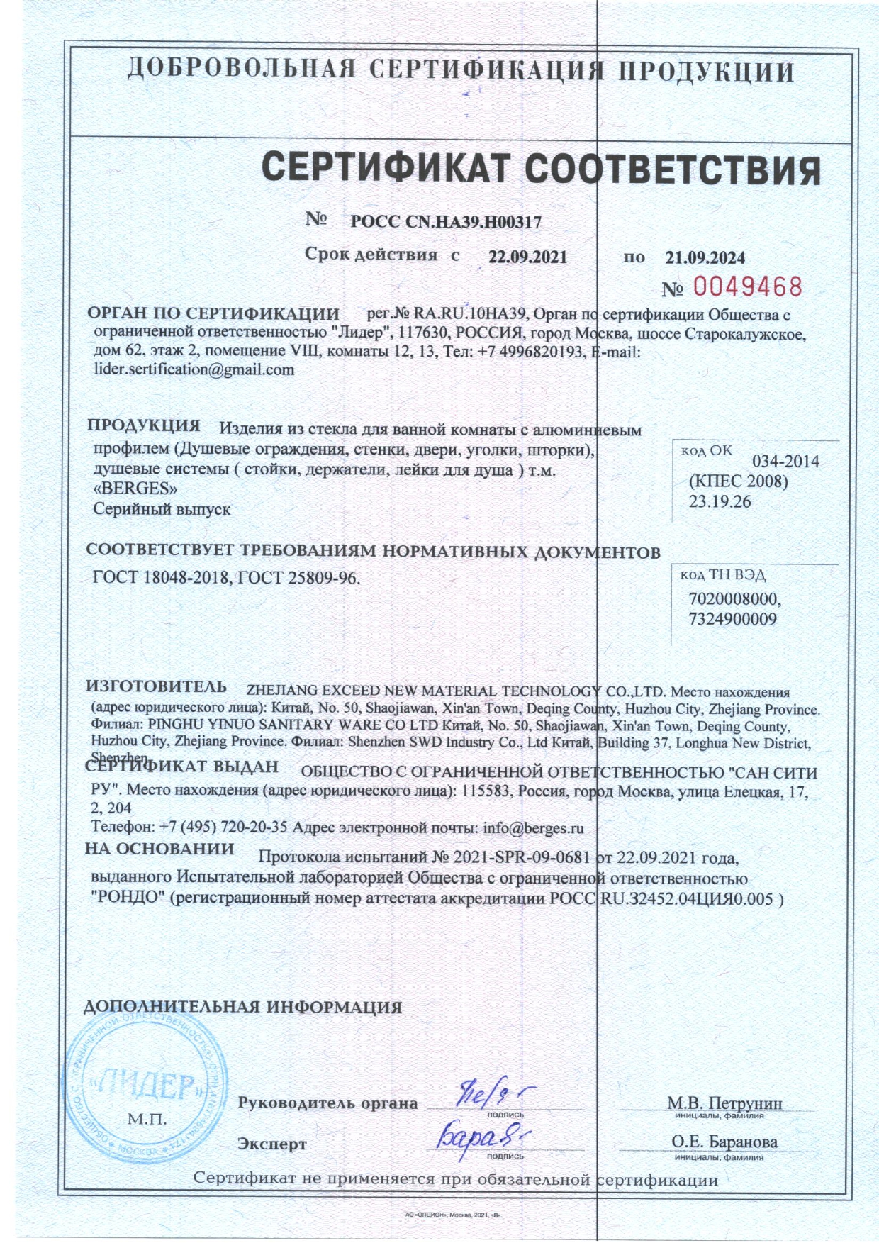 Сертификат соответствия на Душевые ограждения 76.1 кб
